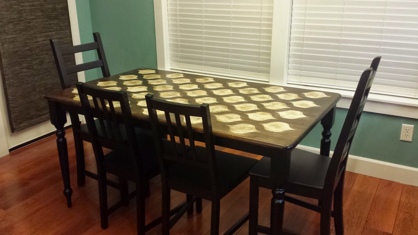 One of those projects was refinishing our table! Since the top of it was severely damaged by a hammer during a project with the kids, it gave me a good excuse to try out something I saw on pinterest! I ordered a stencil awhile ago and we finally got it done before my sister left!